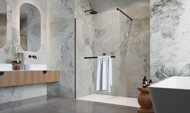 Die ästhetische und zeitlose Form der Walk-in Dusche bildet eine einzigartige Raumklarheit.
