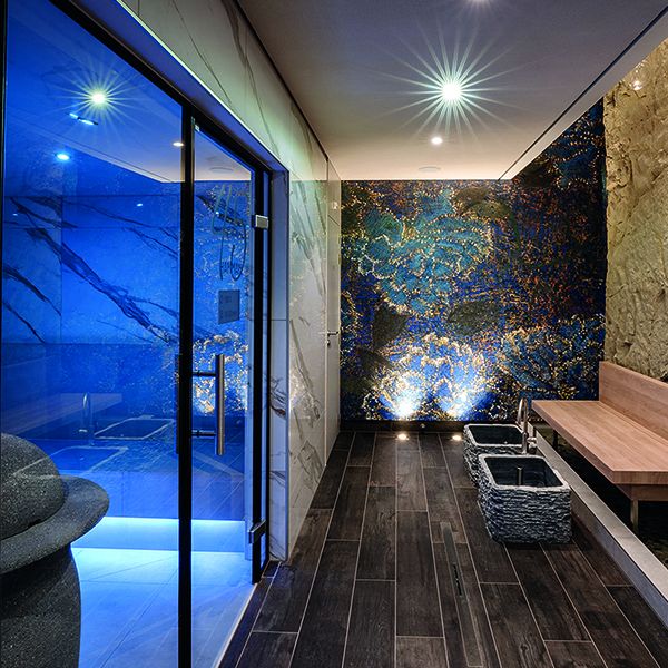 Der Bestands-Wellnessbereich wurde 2021 erweitert und modernisiert. Inhouse56 wurde bei diesem Projekt für alle Leistungsphasen sowie die Lieferung aller Möbel beauftragt. Ein ungenutzter „Kellerraum“, sowie Teile des zu dunklen Innenhofs wurden in den Wellnessbereich integriert, und die Etagen durch einen offenen Lichthof verbunden. Durch die gewonnenen Flächen konnten mehrere Saunen ergänzt werden. Der Weg dorthin führt durch ein Kneippbecken mit Steinboden.