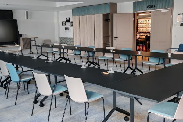 Unser kleiner Tagungsraum befindet sich direkt im Erdgeschoss. Ausgestattet mit einem Samsung Flip Touch), WLAN und Klimaanlage hat er alles, was zum Tagen in Kleingruppen benötigt wird. Der Tisch ist festinstalliert und auf die Technik in Front ausgerichtet, Steckdosen und Anschlüsse sind integriert. Er besticht durch die direkte Nähe zum Serviceteam des Hotelkompetenzzentrums und der Kaffeemaschine.