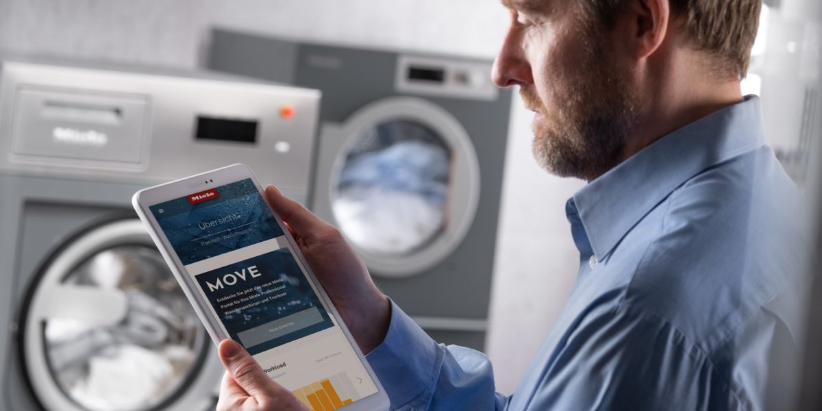 Frischwasserspülmaschinen, Waschmaschinen und Trockner sind mit dem Onlineportal „Miele MOVE“ vernetzbar. Damit lässt sich zum Beispiel auf einem PC, Smartphone oder Tablet überprüfen, wie viele Geräte gerade im Einsatz oder bereits fertig sind – und welche Programme häufig genutzt werden. Praktisch: die leichte Bestellung von Reinigungschemikalien über eine direkte Verlinkung mit dem Miele Professional Shop. Auch Prozessdaten, die für hygienisch sauberes Geschirr und saubere Wäsche entscheidend sind (etwa Temperaturen und Laufzeiten) können mit Miele MOVE gespeichert und bei Bedarf exportiert werden.