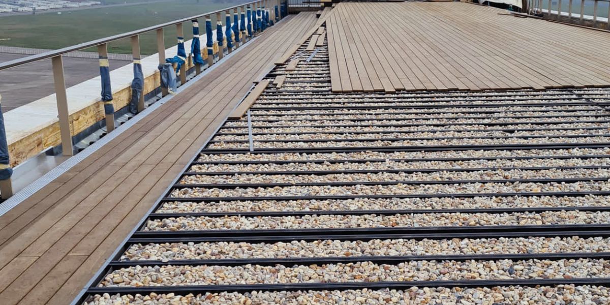Der Deckbelag aus Kebony Clear war mit der erfolgreichen Ausschreibung des schweizer Architekturbüros :mlzd gesetzt, die anspruchsvolle Konstruktion der Rampen, Stufen und Übergänge lag in den Händen der ausführenden Ingenieure. Spezielle Anforderungen an Windlast, Brandschutz und Druckbelastung sowie Materialmix aus Dielen und Platten wurden in enger Zusammenarbeit mit den Verantwortlichen erarbeitet und gelöst.