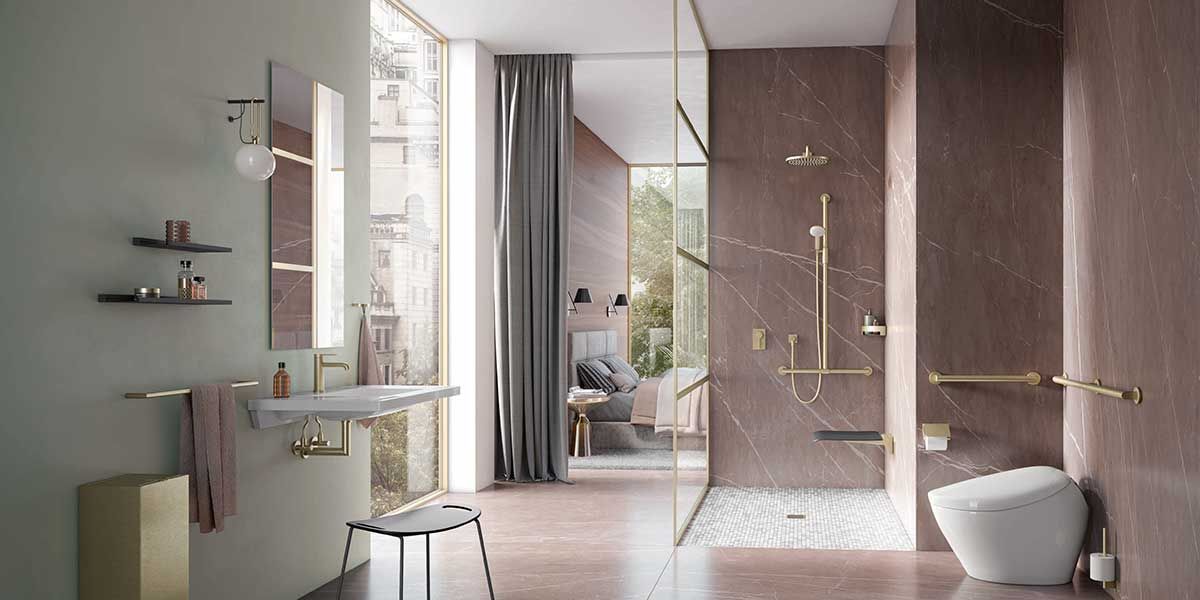 HEWI bietet neue Oberflächen im umweltschonenden PVD-Verfahren für höchste Individualität im Badezimmer. Mehr Glamour im Hotel-Badezimmer.