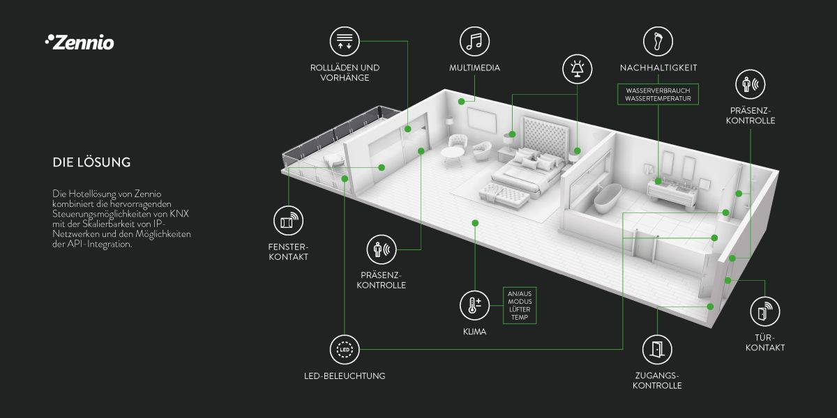 Zennio liefert die Komplettlösung für intelligente Hotelautomation: Licht, Klima, Szenensteuerung, Zutritt, PMS-Anbindung, Visualisierung – alles aus einer Hand. Für Gäste entsteht ein intuitives Komforterlebnis. Für Betreiber bedeutet es Effizienz, Transparenz und einfache Integration. Ohne zusätzliche Gateways. Ohne Schnittstellenprobleme. Ohne Kompromisse.