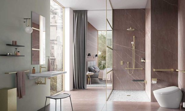HEWI bietet neue Oberflächen im umweltschonenden PVD-Verfahren für höchste Individualität im Badezimmer. Mehr Glamour im Hotel-Badezimmer.